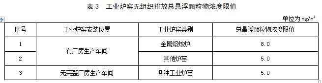 工業爐窯無組織排放總懸浮顆粒物濃度限值按表3規定執行。