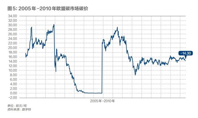 歐盟碳交易起始價較高,2005年初從15歐元/噸價位迅速上漲到28歐元/噸。但在2006年4月底,由于核查排放數據泄露,并顯示發放給成員國的碳配額總數遠高于實際排放,碳配額嚴重過剩。導致每噸碳價從30歐元暴跌至10歐元。此后,由于配額不能存儲到下一階段導致碳價繼續暴跌,到2007年底接近零。