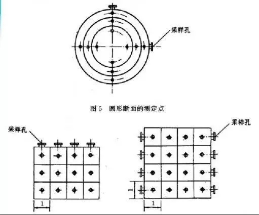 ③對圓形煙道,采樣孔應設在包括各測點在內(nèi)的相互垂直的直徑線上(如下圖所示)。對矩形或方形煙道,采樣孔應設在包括各測點在內(nèi)的延長線上(如下圖所示)。