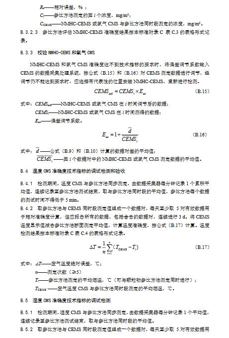 9.3.2.1非甲烷總烴技術指標要求見本標準表1,操作步驟和計算公式按照HJ1013中7.2現場檢測要求和方法及本標準附錄B相關要求執行。準確度驗收時,待測NMHC-CEMS與參比方法同步對現場排放非甲烷總烴進行測量。參比方法可選用HJ38,也可選用國家制訂發布的其它非甲烷總烴測試方法標準。