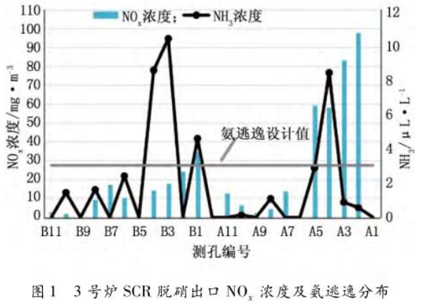 燃煤電廠SCR脫硝超低排放改造后,對其氨逃逸率準確監測可以保證脫硝經濟運行同時實現機組安全穩定運行。對3臺實現超低排放機組的SCR脫硝出口煙氣中氨逃逸率和NOx濃度進行網格法測試,發現NOx濃度分布嚴重不均且氨逃逸率超過設計值問題普遍存在;