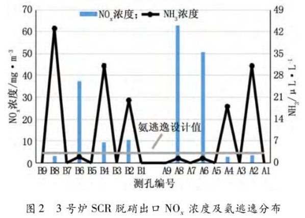 圖2 3號爐SCR脫硝出口NOx濃度及氨逃逸分布