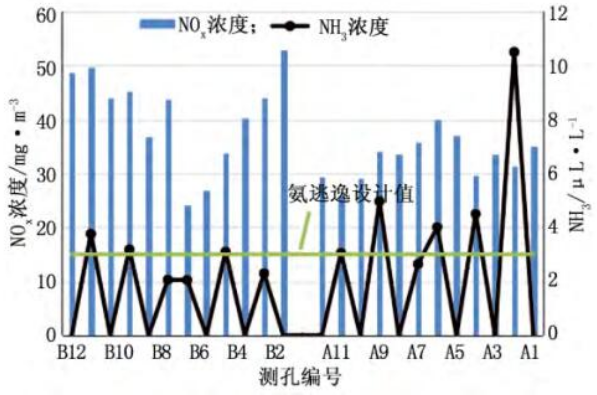 圖1 3號爐SCR脫硝出口NOx濃度及氨逃逸分布