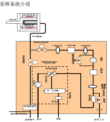 道,以滿足系統反吹的需要。采用一體化采樣伴熱線包。加熱采樣線為電加熱方式。加熱采樣線的加熱套管中有溫度傳感器,由溫度控制器控制并提供伴熱溫度報警信號輸出。在分析儀界面上輸入濕度后,可將被測氣體濃度轉換為干煙氣濃度。分析儀定時會進入校準狀態進行自動調零,此時系統切換到反吹氣路,調零閥打開,在分析儀內部采樣泵的作用下,環境空氣經過直接進入氣體室,對氣體室中殘留的被測氣體進行吹掃,從而實現調零,同時實現氧的量程校準;調零同時,系統控制反吹球閥開或關,實現對伴熱管、探頭過濾器的反吹。
