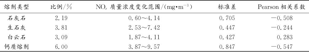 某鋼廠1號(hào)燒結(jié)機(jī)中使用的熔劑主要有石灰石、生石灰、白云石,按照熔劑的主要成分可以分為鈣質(zhì)熔劑與鎂質(zhì)熔劑。表2為該鋼廠的各種熔劑的使用比例與燒結(jié)煙氣中NOx質(zhì)量濃度的相關(guān)性分析結(jié)果。