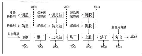 VOCs來源和排放途徑主要有:原輔材料調(diào)配;供料(油墨、光油或膠黏劑);印刷、上膠、上光油、復合等工藝過程;烘干及設備清洗等過程中溶劑的揮發(fā),其中揮發(fā)量最大的為烘干,其次為供料過程。在供料過程中,為保證黏度要求,槽中的物料通過槽子底部的孔流入供料桶中,添加稀釋劑后再由泵打入供料槽中,因此處于不斷循環(huán)狀態(tài)。
