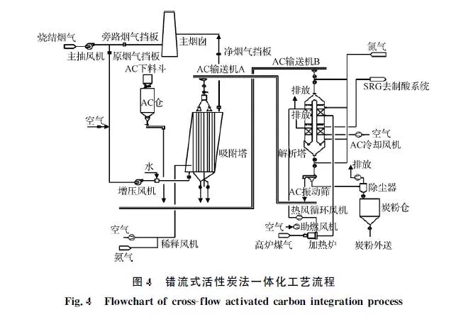 活性炭一體化工藝從煙氣和活性炭運動方式看可分為兩類:錯流式和逆流式。錯流式中活性炭和煙氣分別作垂直運動和水平運動,兩者在運動方向垂直接觸,在國內應用相對較早,典型有太鋼、日照等。逆流式工藝中活性炭自上而下、煙氣自下而上,兩者逆流相向接觸,在國內河鋼邯鋼將逆流式工藝首次應用于燒結煙氣處理。