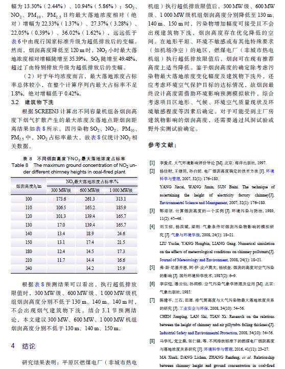 摘 要:燃煤電廠全面實施超低排放后,煙氣污染物排放水平大幅降低,是否仍需采用高煙囪排放已引起關注。以平原區不同容量燃煤電廠為例,對超低排放水平下煙囪高度與污染物最大落地濃度關系進行研究,并對特定高度下是否出現建筑物下洗進行判定,分析煙囪高度優化的可能性。研究結果表明:平原區燃煤電廠執行超低排放限值后,300 MW、600 MW、1 000 MW級機組煙囪從現有推薦高度分別降低至130 m、140 m、150 m時,污染物最大落地濃度增幅不顯著,初步判定污染物增加幅度可接受且不會出現建筑物下洗,煙囪高度存在優化降低的空間。