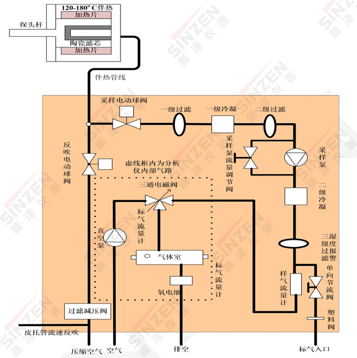 樣氣通過取樣探桿進(jìn)入到取樣探頭內(nèi),經(jīng)過陶瓷濾芯過濾后,除去樣氣中的粉塵;取樣探頭通過加熱器加熱到120°C~150°C,防止樣氣在經(jīng)過取樣探頭后,產(chǎn)生冷凝水。來自采樣探頭的樣氣經(jīng)高溫伴熱管線,通過二級過濾器除塵,經(jīng)過兩級冷凝系統(tǒng)除水后直接進(jìn)入分析儀內(nèi)測量氣體室,氣體室放置于分析儀內(nèi),通過紫外光纖連接到紫外差分分析儀,實(shí)現(xiàn)對煙氣的測量,最后通過采樣泵將被測煙氣排空;冷凝下來的水經(jīng)排水系統(tǒng)排掉。由控制單元實(shí)現(xiàn)自動反吹、自動標(biāo)定、制冷溫度報(bào)警提示等功能,并顯示系統(tǒng)的各種工作狀態(tài)。