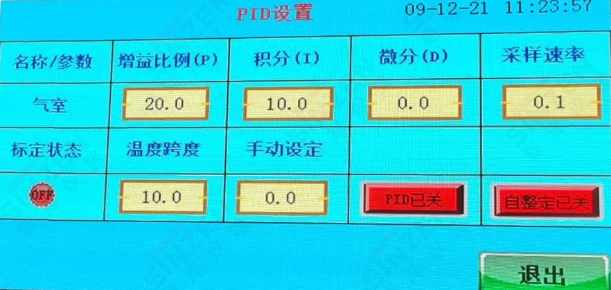 溫度PID自整定畫面應(yīng)該是PID已關(guān)按鍵變成綠色按健,PID已開為正常狀態(tài)。當溫度到達180度設(shè)置值后,需要手動點擊一下自整定已關(guān)按鍵,變成綠色,自整定已開,經(jīng)過一分鐘后自動恢復紅色狀態(tài)。